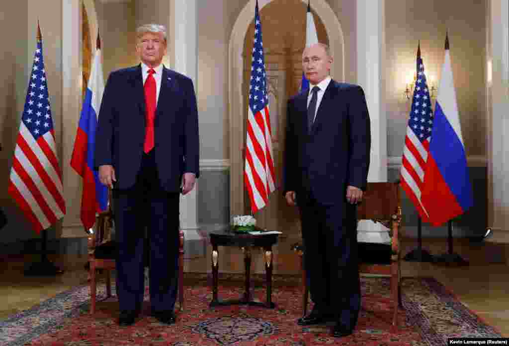 Президент США Дональд Трамп и президент России Владимир Путин обратились к журналистам перед встречей тет-а-тет, которая из-за опоздания российского президента началась почти на час позже.