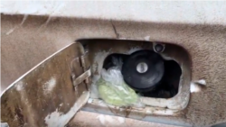 Сергей Акимов также открывает отсек автомобильного бака и показывает там две емкости с бензином.